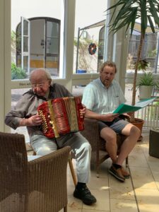 Am Samstag erhielten wir im Wintergarten  Besuch von Sepp Denninger und Martin Günzel. Unsere Bewohner hatten sich bereits auf diesen Nachmittag gefreut. Die Veranstaltung begann mit einigen volkstümlichen Frühlingsliedern, die von Sepp Denninger auf seinem Akkordeon begleitet wurden. Zwischendurch trug Martin Günzel einige mundartliche Gedichte vor. Dabei kamen spontane Gespräche über die Vergangenheit von Kitzingen auf, z. B. über den Besuch von Konrad Adenauer im Kitzinger Rathaus. Sowohl alle anwesenden Bewohner als auch Angehörige empfanden den Nachmittag als äußerst gelungen und informativ. Vielen Dank an Sepp Deniger und Martin Günzel.