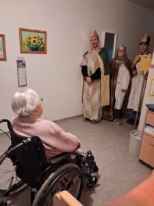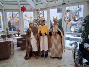 Am 6. Januar war es wieder so weit. Die Heiligen Drei Könige der KJG besuchten unser Seniorenheim und brachten den Bewohnerinnen und Bewohnern den traditionellen Sternsinger Segen. Zunächst versammelten sich alle im Wintergarten, wo Kaspar, Melchior und Balthasar mit Gedichten und Liedern für eine feierliche Stimmung sorgten. Anschließend zogen die Sternsinger weiter durch das Haus und besuchten die Wohnbereiche und einzelne Bewohnerzimmer, um dort persönlich den Segen zu überbringen.