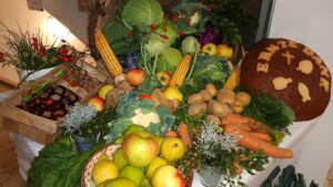 Mit Kürbissen, Äpfeln, Trauben, Getreide, Nüssen und anderen Feldfrüchten, oft auch mit Blumen und einem Brot. Sie sollen zeigen, wofür wir dankbar sein können – für Nahrung, Natur und das Miteinander.