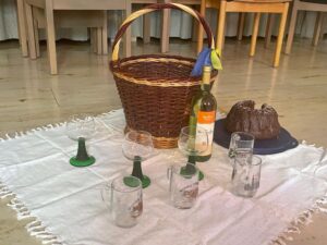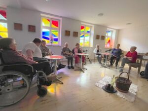 Heute fand im Haus ein besonderer Versuch statt. Gemeinsam mit sieben Bewohnerinnen und Bewohnern hörten wir das bekannte Märchen „Rotkäppchen“ als Hörspiel. Um die Atmosphäre der Geschichte lebendig werden zu lassen, reichten wir – wie im Märchen – etwas Wein und einen selbstgebackenen Kuchen. So entstand eine gemütliche und zugleich märchenhafte Stimmung, in der sich alle Teilnehmenden ganz auf das Hörspiel einlassen konnten.