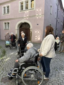 Am Ausstellungstag werden dann noch Sprüche für eine lebhafte Demokratie an den Schal angebracht. Jeder kann sich einen Spruch einfallen lassen. Die fertigen Teile wurden schon mal an Bürgermeisterin Astrid Glos weitergegeben, die die Teile zu einem langen Schal zusammenfügen lässt. Die BewohnerInnen freuen sich schon auf das Gesamtergebnis.