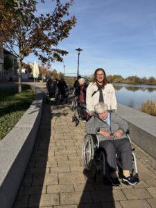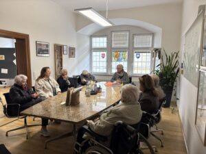Am Ausstellungstag werden dann noch Sprüche für eine lebhafte Demokratie an den Schal angebracht. Jeder kann sich einen Spruch einfallen lassen. Die fertigen Teile wurden schon mal an Bürgermeisterin Astrid Glos weitergegeben, die die Teile zu einem langen Schal zusammenfügen lässt. Die BewohnerInnen freuen sich schon auf das Gesamtergebnis.