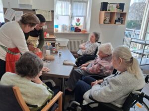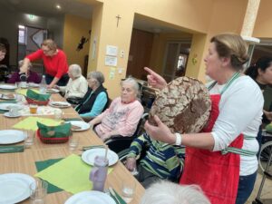 Am Samstag, dem 07. März, drehte sich im Mehrgenerationenhaus alles um das Thema Brot. In einem Wohnbereich wurde gemeinsam Brot gebacken. Der Duft von frisch gebackenem Brot zog durch das ganze Haus und sorgte für eine gemütliche Atmosphäre. Am Abend kamen alle im Speisesaal/Wintergarten zusammen. Dort wurde ein großes Steinofenbrotrad traditionell von Hand aufgeschnitten. Dazu gab es verschiedene Aufstriche wie Kräuterquark und Griebenschmalz, sowie Butter mit frischem Schnittlauch. Während des gemeinsamen Essens wurde gerätselt und gelacht. Die Bewohnerinnen und Bewohner beantworteten Fragen rund ums Brot – z.B., wie das Endstück eines Brotes genannt wird. Begriffe wie „Ringele“, „Kanten“ oder „Knorz“ Wurden genannt und sorgten für viele Schmunzler. Auch bekannte Sprichwörter rund ums Brot wurden erraten, etwa „In der Not schmeckt die Wurst auch ohne Brot“ oder „Trocken Brot macht Wangen rot“. Darüber hinaus erfuhren die Teilnehmenden auch etwas über die Geschichte des Brotes. Schon im alten Ägypten wurde Brot gebacken und gehört damit zu den ältesten Grundnahrungsmitteln der Menschheit. Organisiert und begleitet wurde der Nachmittag und Abend von Petra Dlugosch vom Mehrgenerationenhaus sowie Parya Etemadi. Ein herzliches Dankeschön an die zwei, sowie dem Personal der sozialen Betreuung.