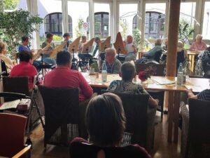 Gestern verwandelte sich unser Haus in eine fröhliche Mitsing-Oase: Die Musikgruppe aus Albertshofen spielte im Wintergarten und im angrenzenden Speisesaal ein buntes Programm aus klassischen Volksliedern. Bei strahlendem Sonnenschein wurde jeder Ton von guter Laune begleitet – das ließ sich an den fröhlichen Gesichtern aller Teilnehmerinnen und Teilnehmer deutlich ablesen.