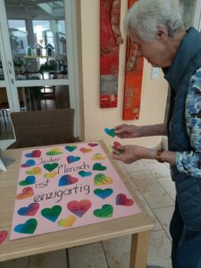 Im Vorfeld haben sich Bewohnerinnen im Rahmen des Frauenstammtischs mit dem Thema beschäftigt. Dabei entstanden mehrere Plakate, die verschiedene Aspekte von Individualität und Vielfalt thematisieren.