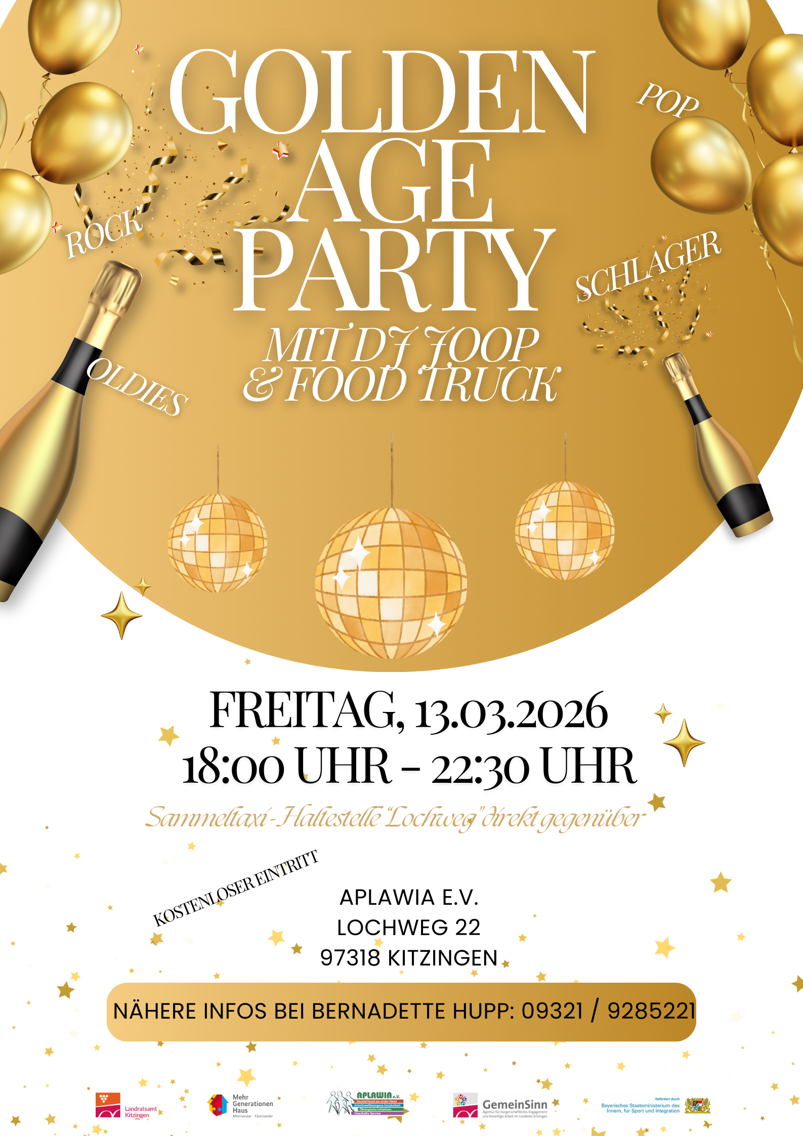 Wir freuen uns, euch zu unserer Golden Age Party einzuladen – ein aufregendes Kooperationsprojekt mit Aplawia e.V. , Freiwilligenagentur GemeinSinn Kitzingen und der Integrationslotsin des Landratsamtes! Kommt vorbei und erlebt einen unvergesslichen Abend mit Food Truck und DJ Joop, der für die besten Beats sorgt. Tanzt, feiert und habt Spaß in einer tollen Gemeinschaft! Veranstaltungsort: […]
