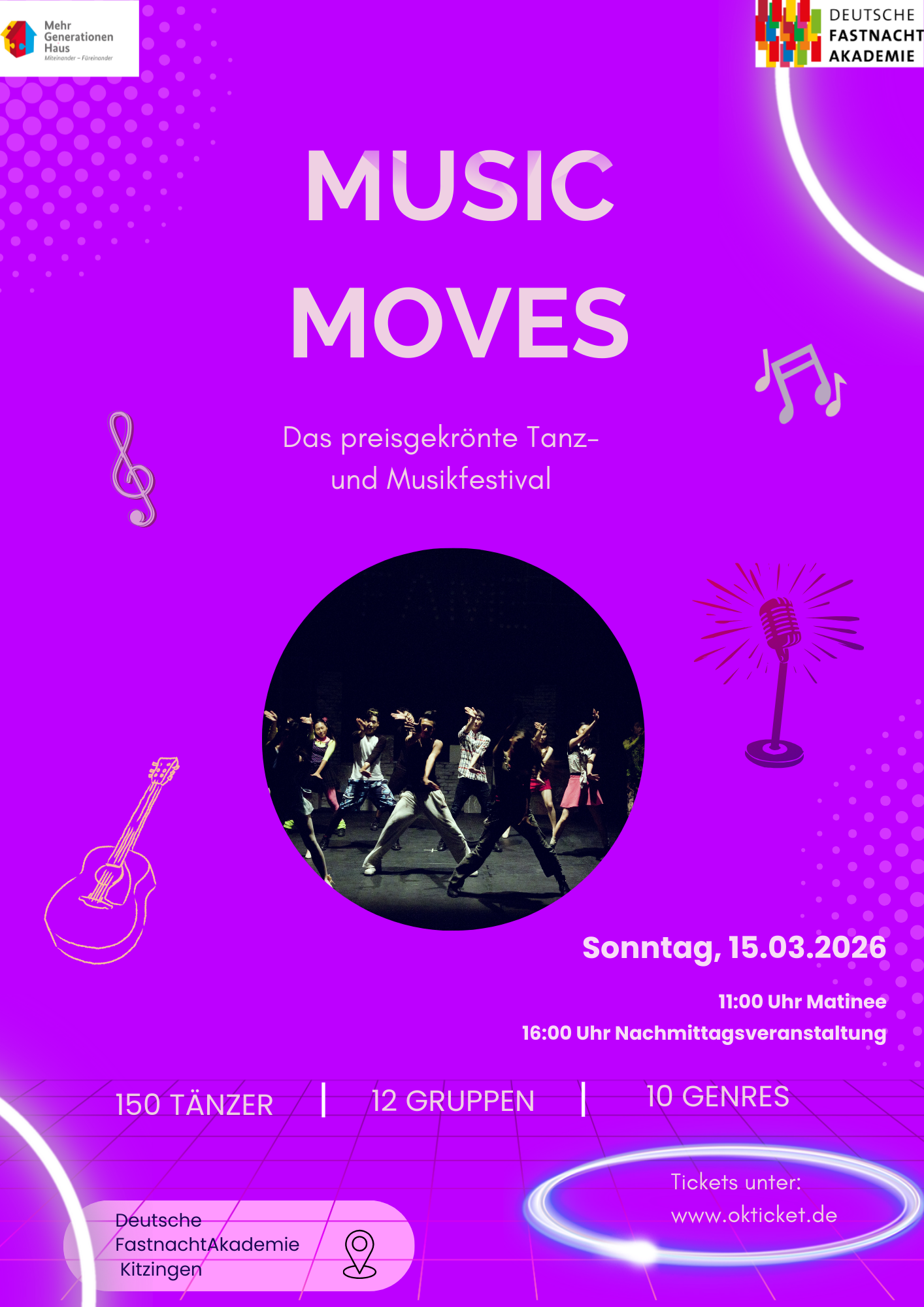 Herzliche Einladung zu MUSIC MOVES - dem Tanz- & Musikfestival für jung und alt. Denn Musik bewegt uns alle! Hier können alle zusammen Musik genießen und zeigen, wie wertvoll Tanz in jedem Lebensalter und jeder Lebenslage sein kann. Ein Nachmittag voller Genuss! Eintritt: 5-6 € Karten unter: https://www.okticket.de Weitere Infos unter: mgh.kitzingen@caritas-einrichtungen.de